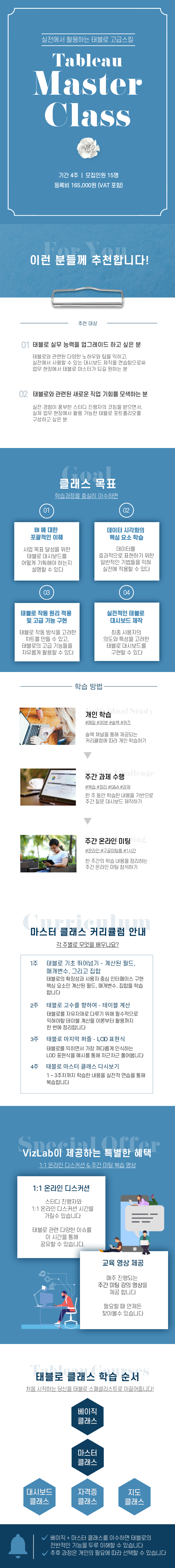 태블로 마스터 클래스는 실전에서 태블로를 자유자재로 사용하기 위해 필요한 개념과 기능들을 정리하는 과정입니다. 6월4일(목) ~ 7월1일(수)까지 4주간 진행되며, 매주 1회 모이는 주간 온라인 �