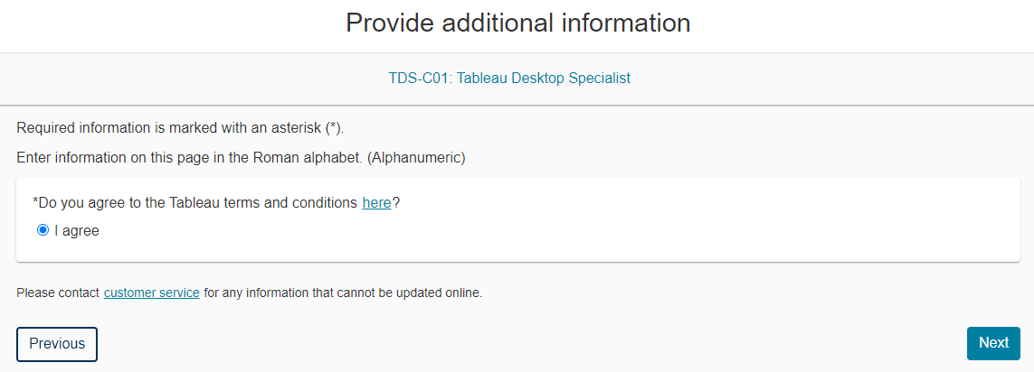 Next 버튼을 누르면 장황한 설명들이 나옵니다. 여유있는 분들은 꼼꼼히 읽어보시면 되고, 저는 그냥 체크만 하고 넘어가겠습니다. 아래쪽으로 내려가면(스샷에는 없음) 태블로의 정책이 나오는데 굵게 표시된 부분 두개만 정리하겠습니다. 첫째, 시험 당일 30분 일찍 와라, 둘째, 시험 일정을 조정하려면 $25 지불해야한다, 입니다