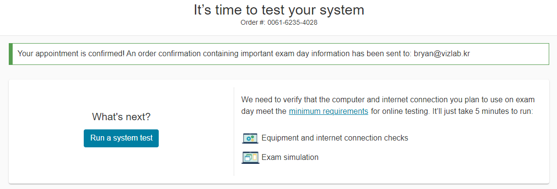 (보너스) 결제가 끝나면 시스템 테스트 요청하는 창이 나옵니다. 아무래도 온라인으로 진행되는 테스트이기 때문에 기술적인 요소에 대한 테스트가 필요한 것으로 보입니다. "Run a system test" 클릭한 후 진행하면 됩니다