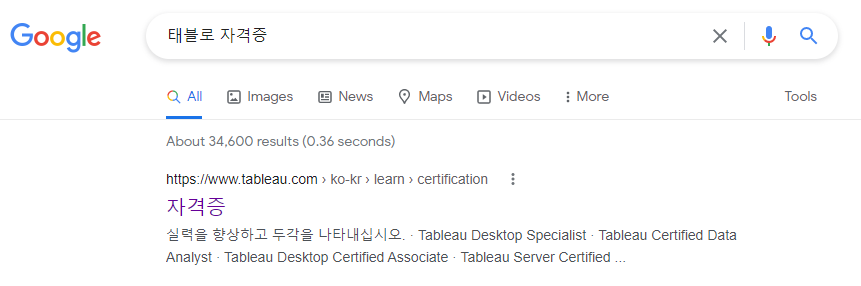 구글에서 "태블로 자격증" 입력하면 가장 위쪽에 관련 검색 결과가 나오는 것을 확인할 수 있습니다