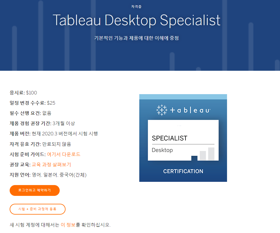태블로 데스크탑 스페셜리스트 자격증 시험 신청 방법을 순서대로 정리해보았습니다. 어렵지 않기 때문에 혼자 진행하셔도 큰 문제가 없지만, 한 번 쓰윽 보고 신청하시면 쉽게 갈 수 있을 것입니다 :D