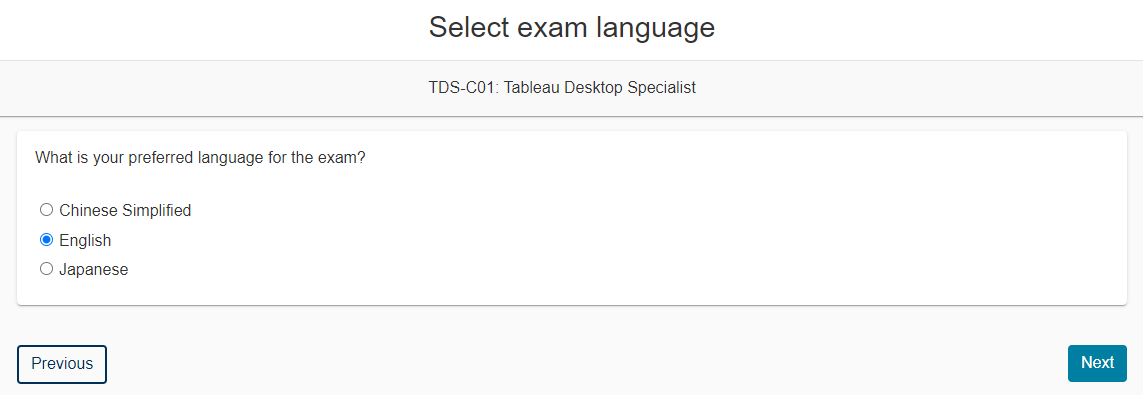 Next 버튼을 누르면 시험 언어 설정에 대한 질문이 나옵니다. 셋 중 그나마 나은 영어를 선택해봅니다