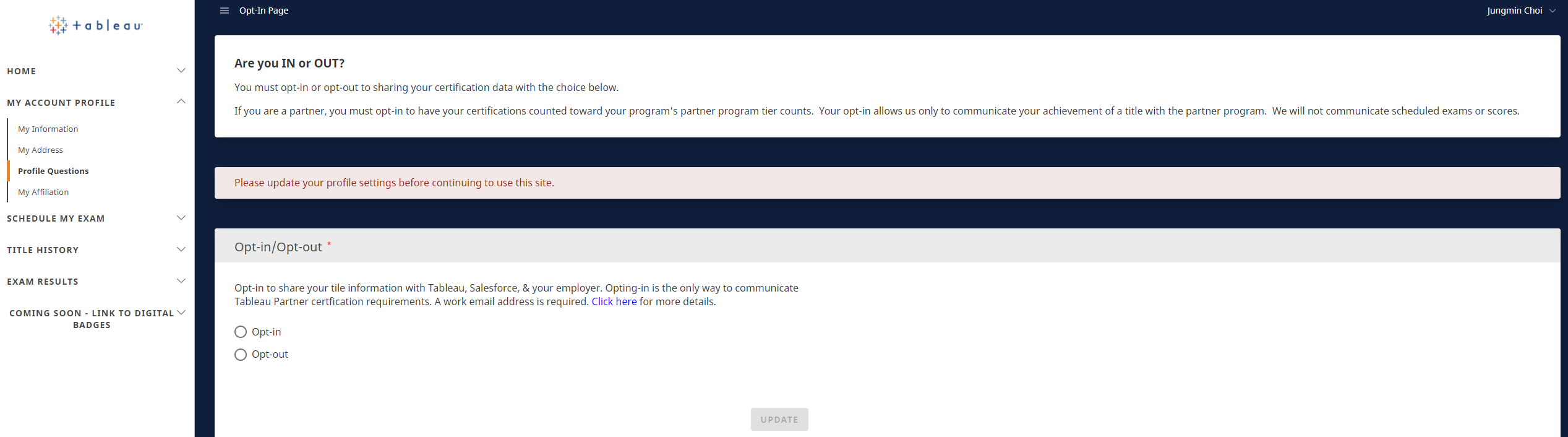 개인정보 업데이트 이후 왼쪽 메뉴를 이용해서 Profile Questions 항목으로 넘어갑니다. 태블로 파트너사 소속이 아닌 분들은 굳이 Opt-in을 선택할 필요가 없어 보입니다
