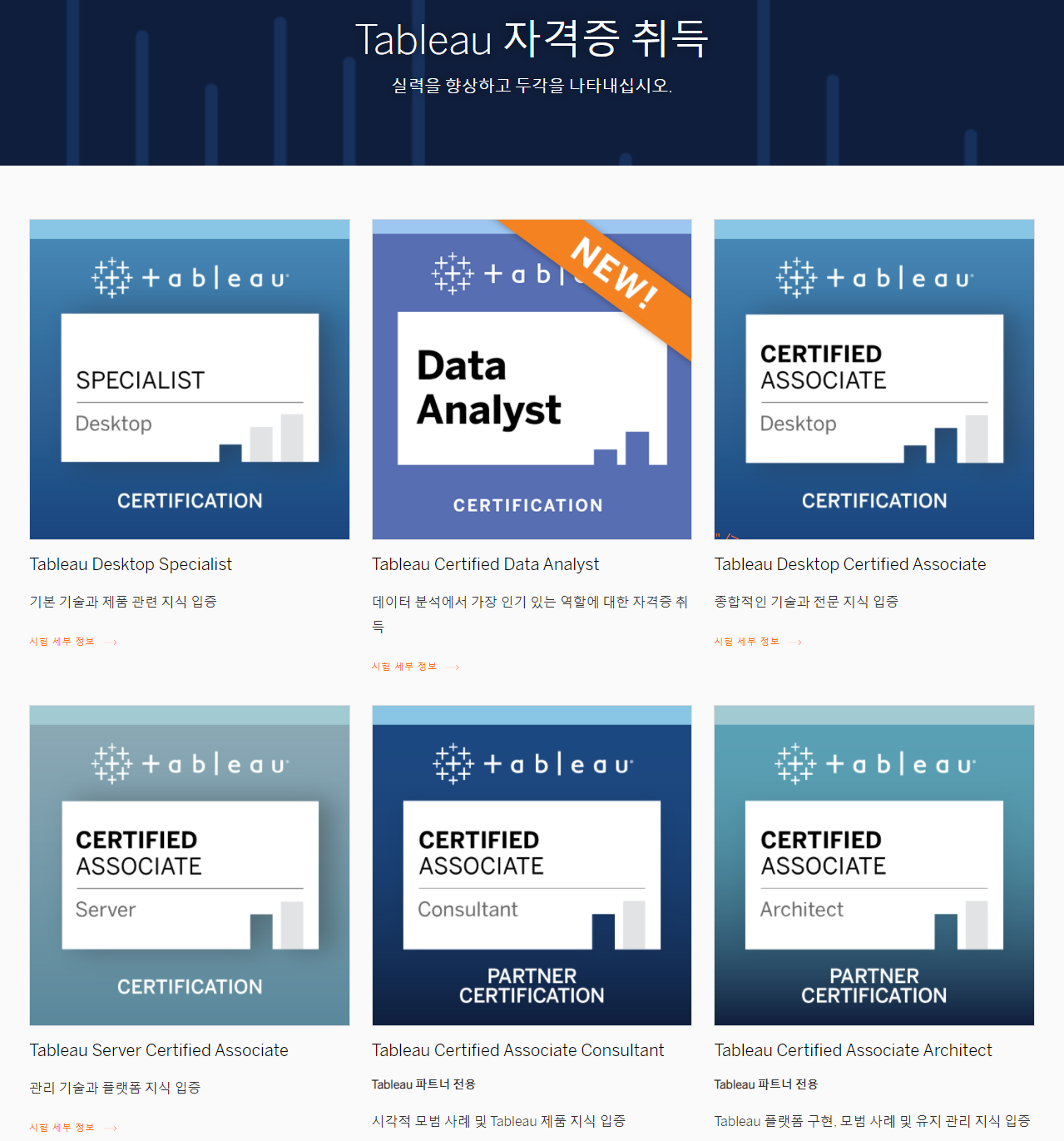 가장 위의 링크를 클릭하고 들어가면 아래와 같이 총 6개의 자격증이 확인되고 있습니다. 우리가 도전할 자격증은 왼쪽 상단의 Tableau Desktop Specialist 입니다