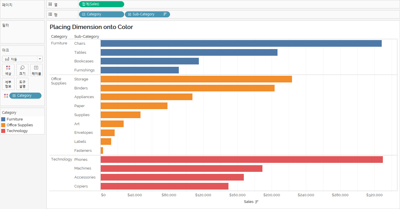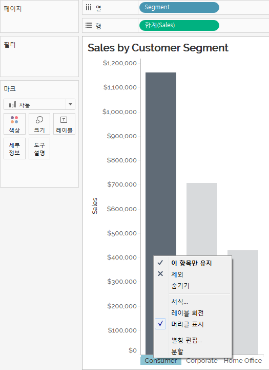 불연속형을 행/열 선반에 올리면 우측 그림과 같이 필드의 항목명 - Customer, Corporate, and Home Office - 이 리스트됩니다
