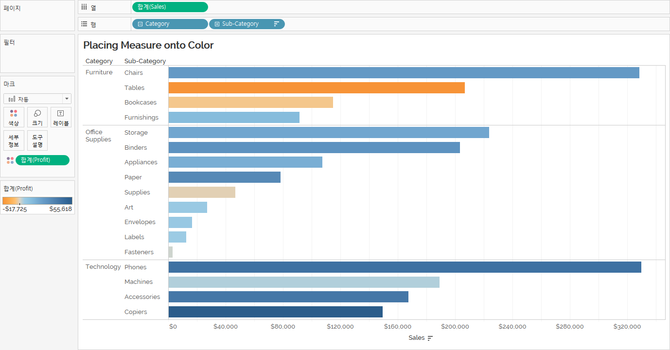 연속형 필드를 마크 카드 색상에 올리면 색상이 한 가지 또는 두 가지 색상이 톤을 다르게하여 표현되고,