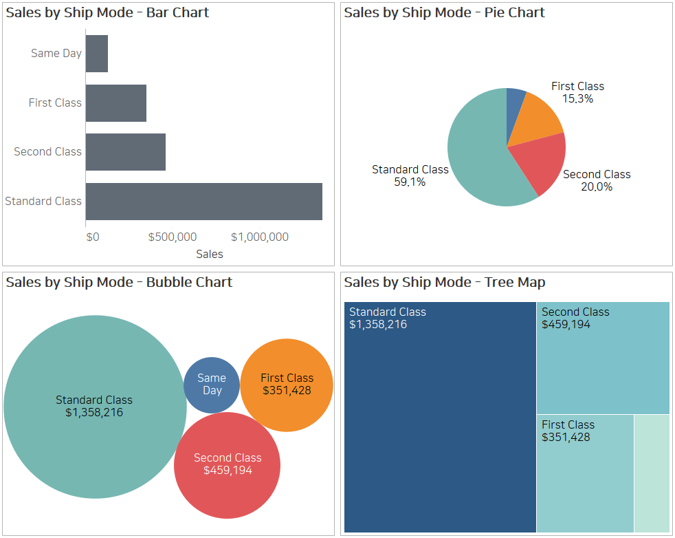 즉, 위의 네 가지 예시에서 매출(Sales)을 배송방법(Ship Mode)으로 썰어서 보는 것은 모두 똑같습니다