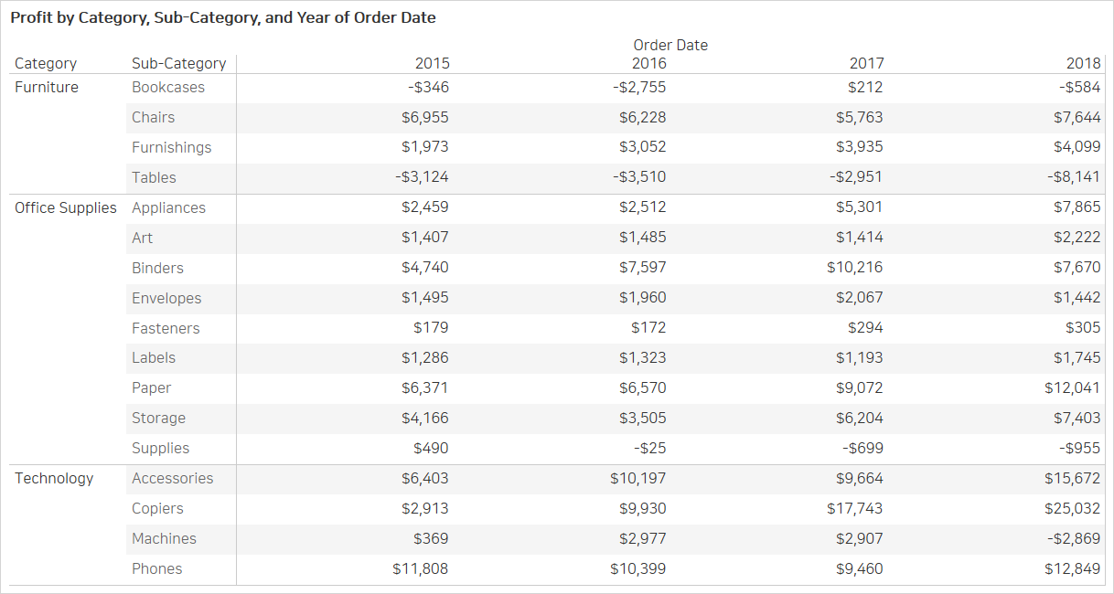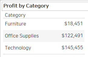 수익(Profit)을 제품 대분류(Category)로 보면, 꽤 높은 수준에서 집계되어 있습니다