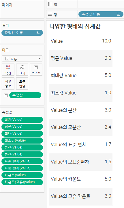 평균, 최대값, 최솟값, 중위수 등이 모두 집계의 방법들이며, 물론 태블로에서는 이와 같은 집계 방법들도 사용할 수 있습니다