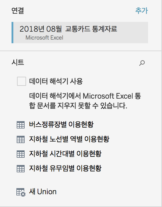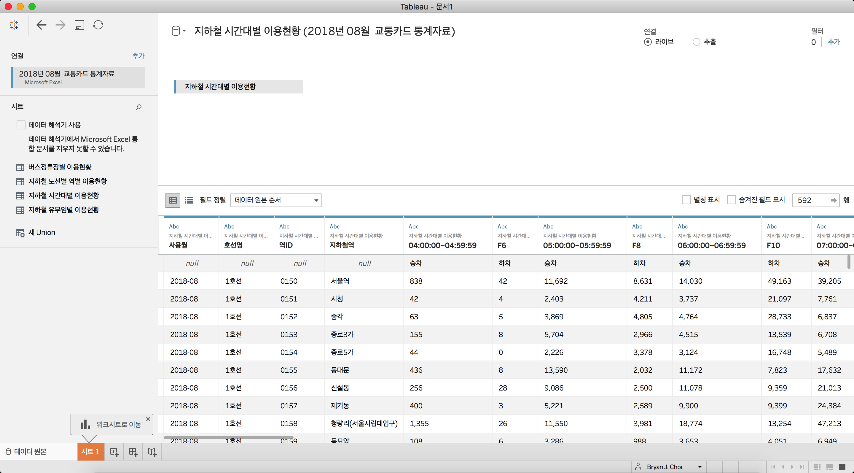 먼저 데이터를 태블로에 연결한 후 '지하철 시간대별 이용현황' 시트를 Drag & Drop 합니다