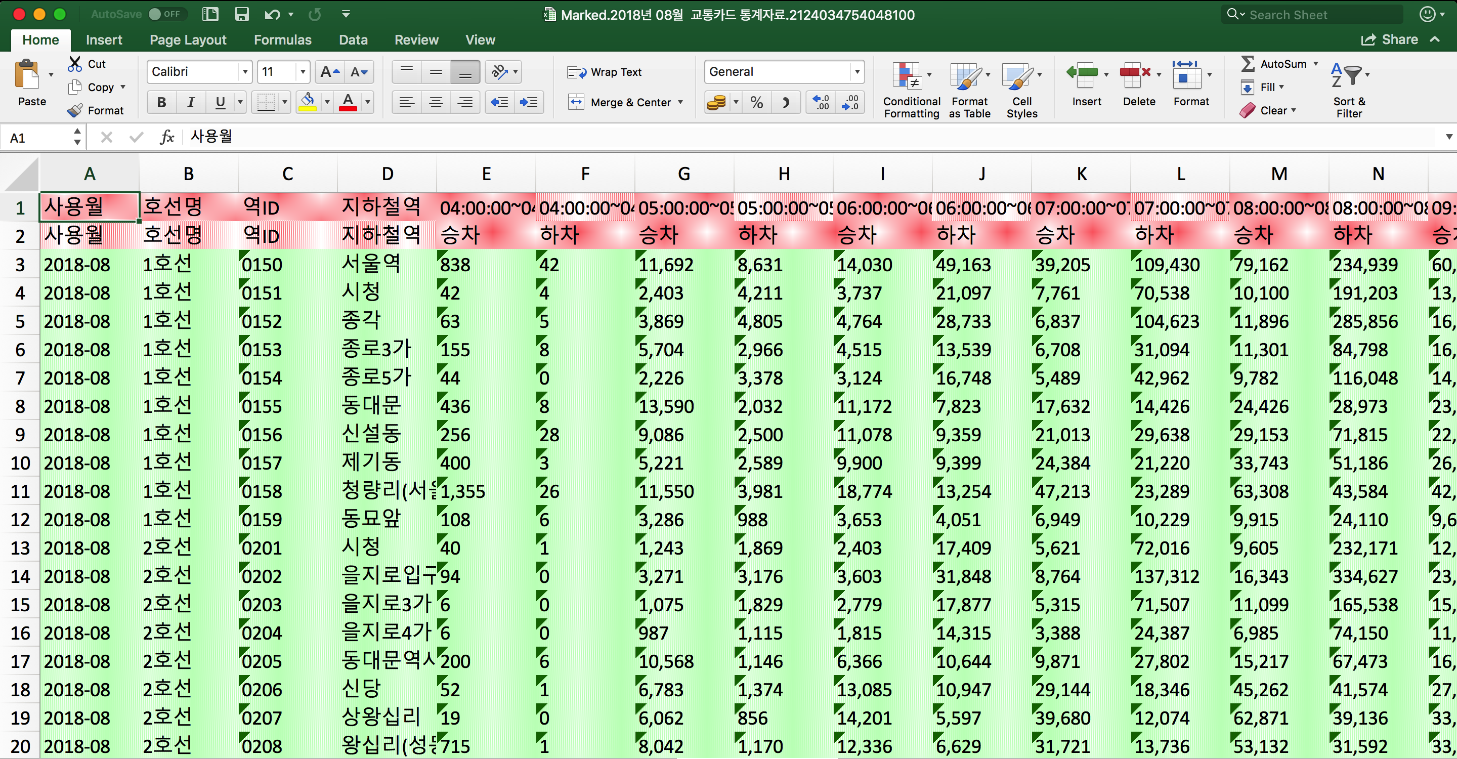 2018년 8월 교통카드 통계자료 엑셀 파일을 다운로드 받았습니다