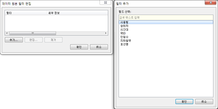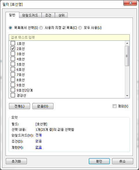 위의 오른쪽 그림에서 호선명을 선택한 후 확인 버튼을 누르면, 아래 그림과 같이 호선을 필터링할 수 있는 대화창이 뜨게 됩니다