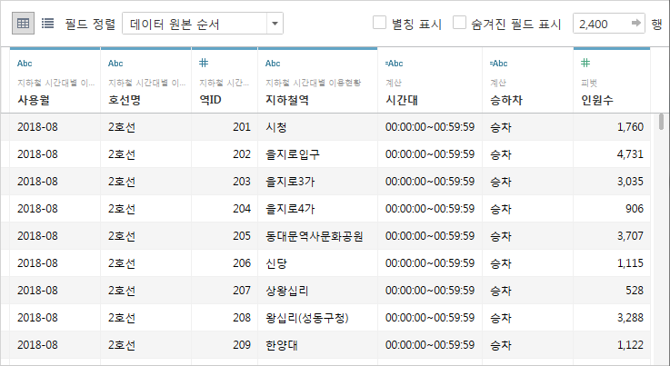 승하차 필터의 경우에는 총 2,400개 행의 승하차 필드를 스캔한 후 '승차'만 가지고 오겠지요