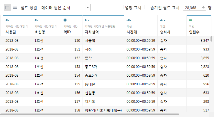 태블로는 우선 28,368개 행의 호선명 필드를 스캔하면서