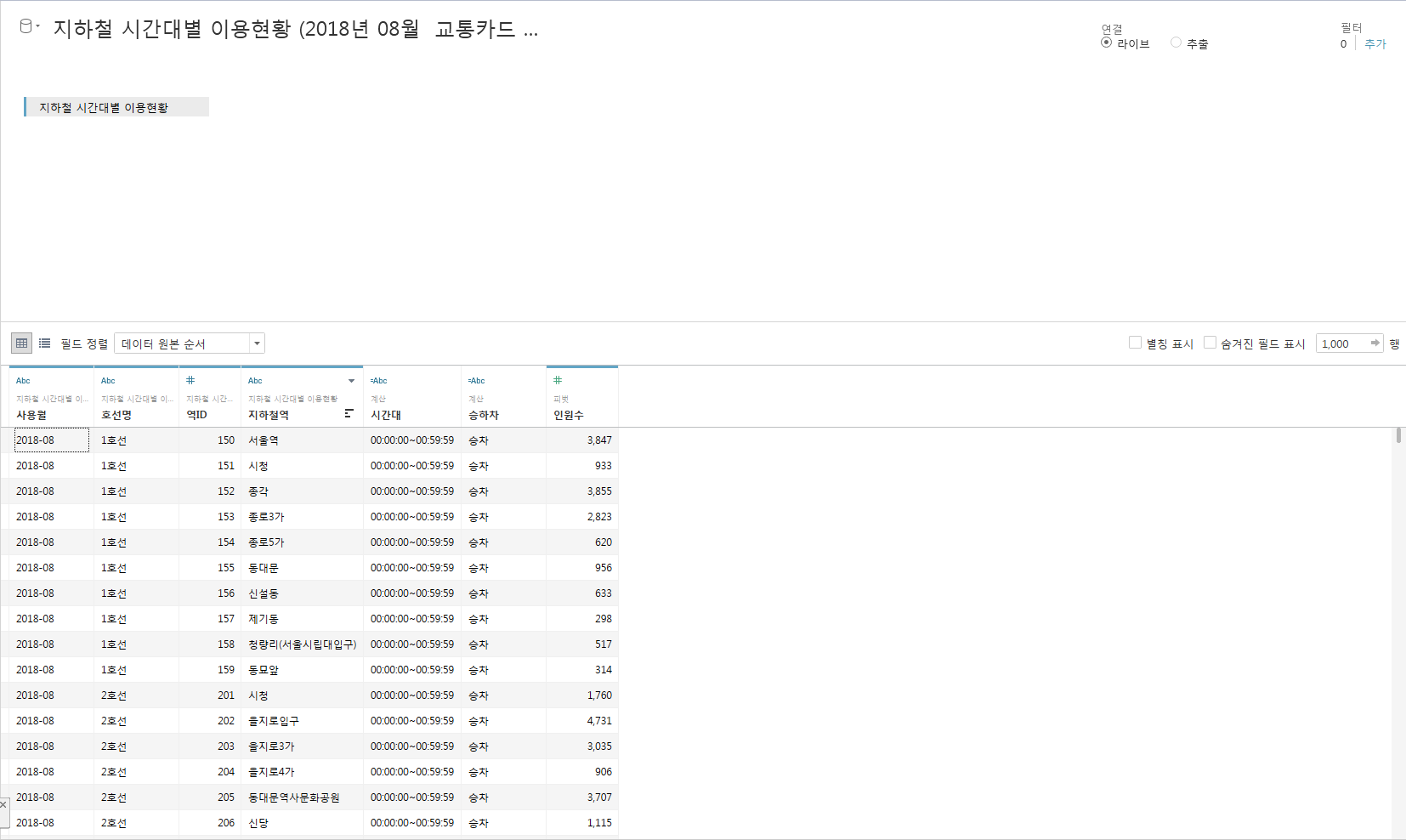 이번 주제 또한 Data Preparation에서 계속 활용하고 있는 '교통카드 데이터 - 지하철 시간대별 이용현황'을 활용합니다