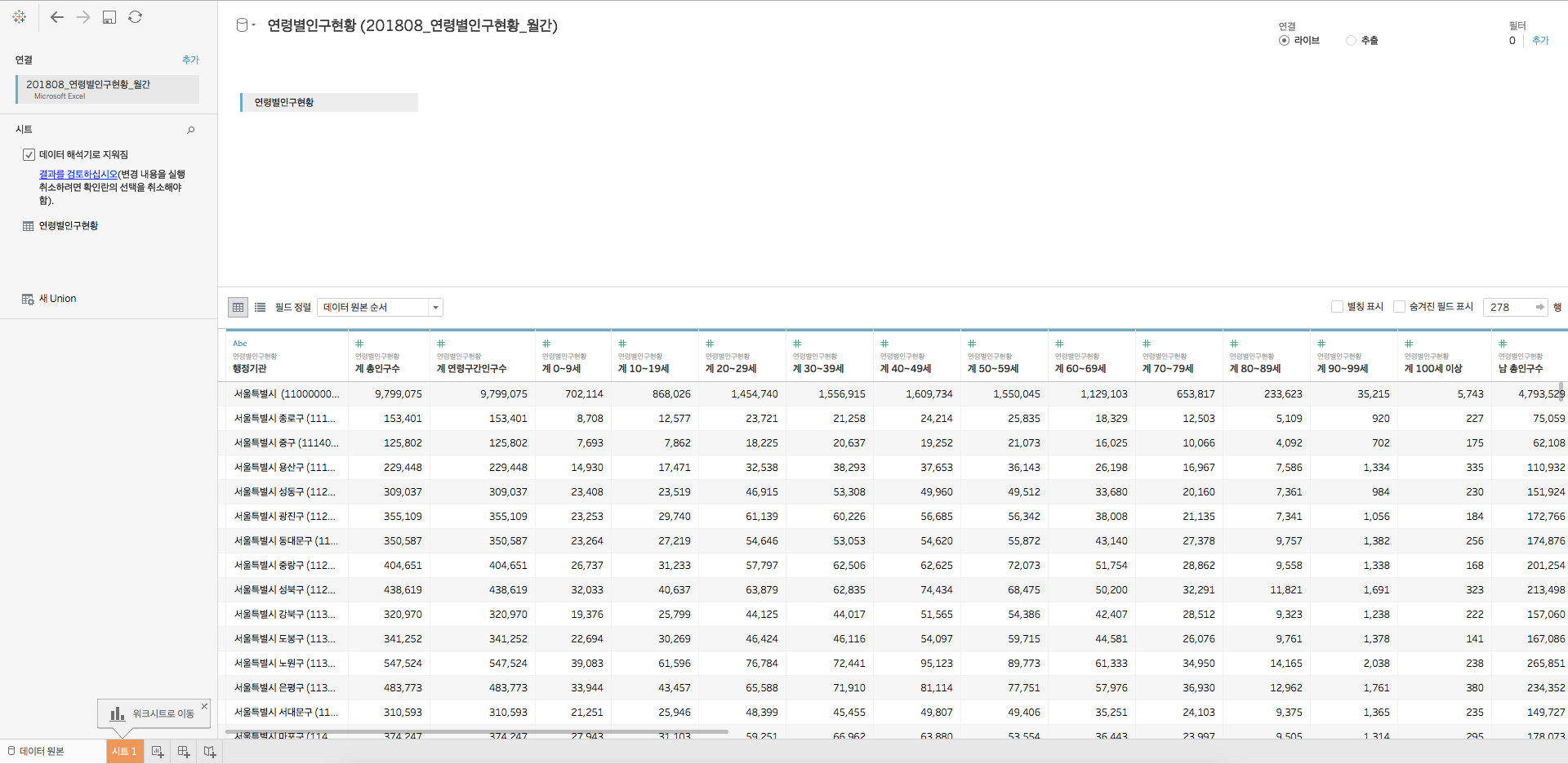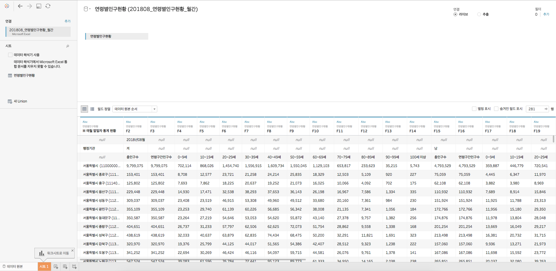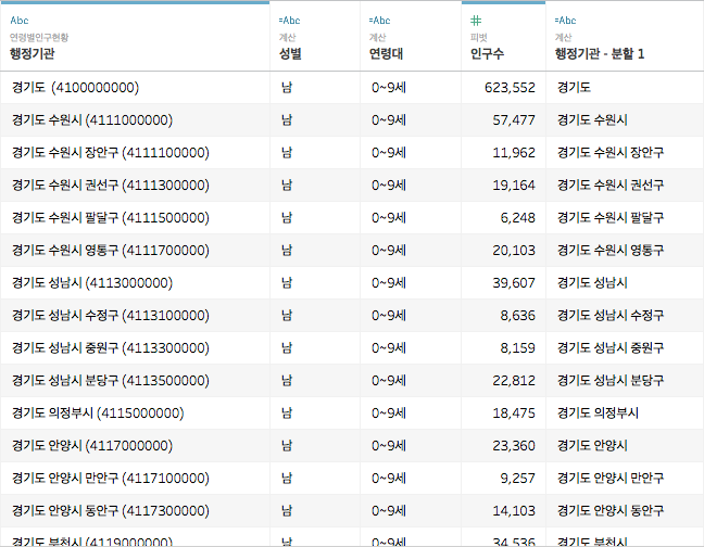 다만, 성별 정보와 연령 정보가 필드명에 함께 들어가있는데, 이 부분은 뒤쪽의 사용자 지정 분할을 통해 정리하도록하죠