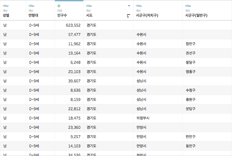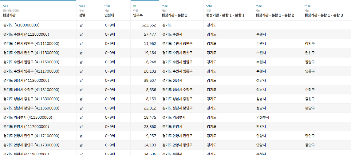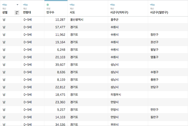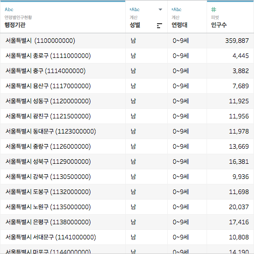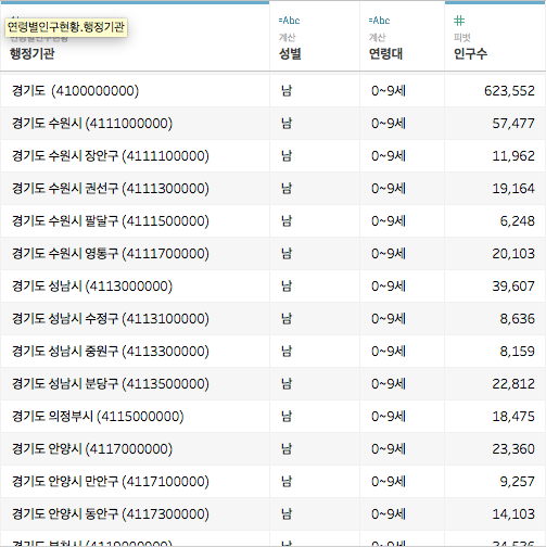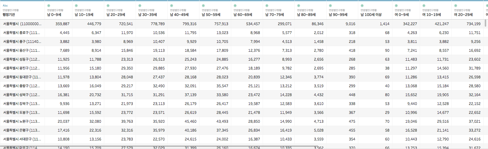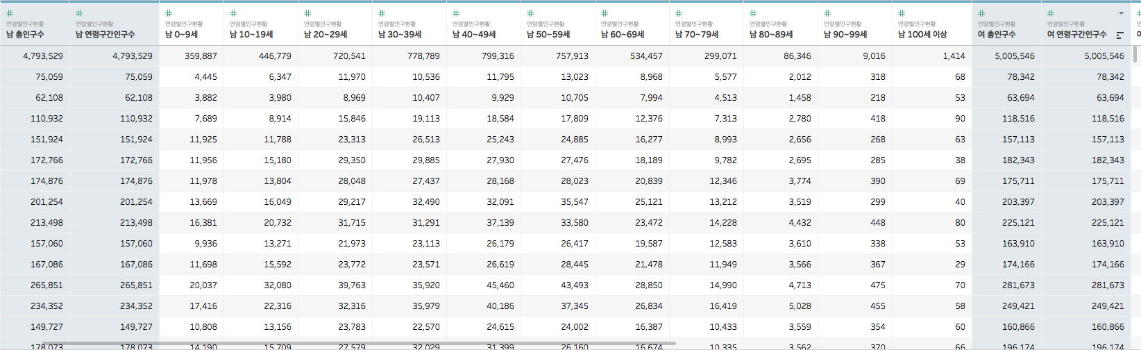 열에는 인구수 정보가 있는데, 먼저 계가 나오고, 다음으로는 남성이 보입니다. 위의 그림에서는 잘려서 보이지 않지만 옆에 여성도 있습니다