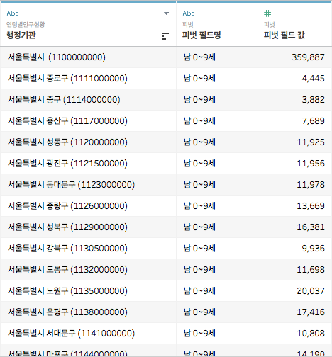 '분할 1'의 필드명을 성별로, '피벗 필드 값'의 필드명을 인구수로 바꾸도록 하겠습니다