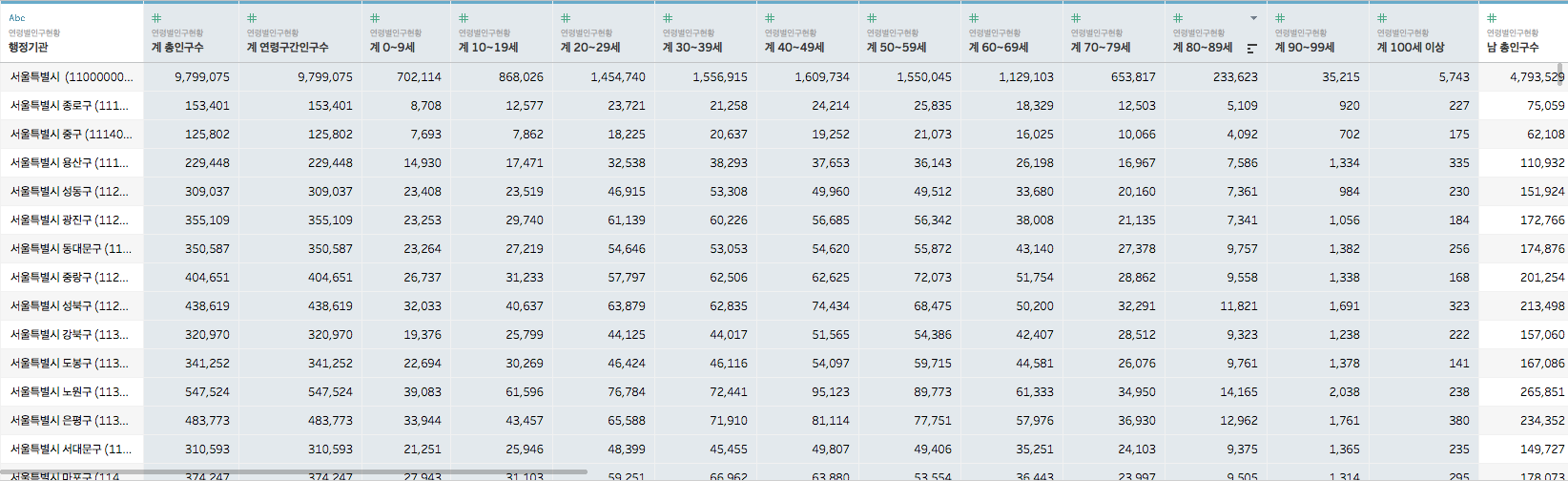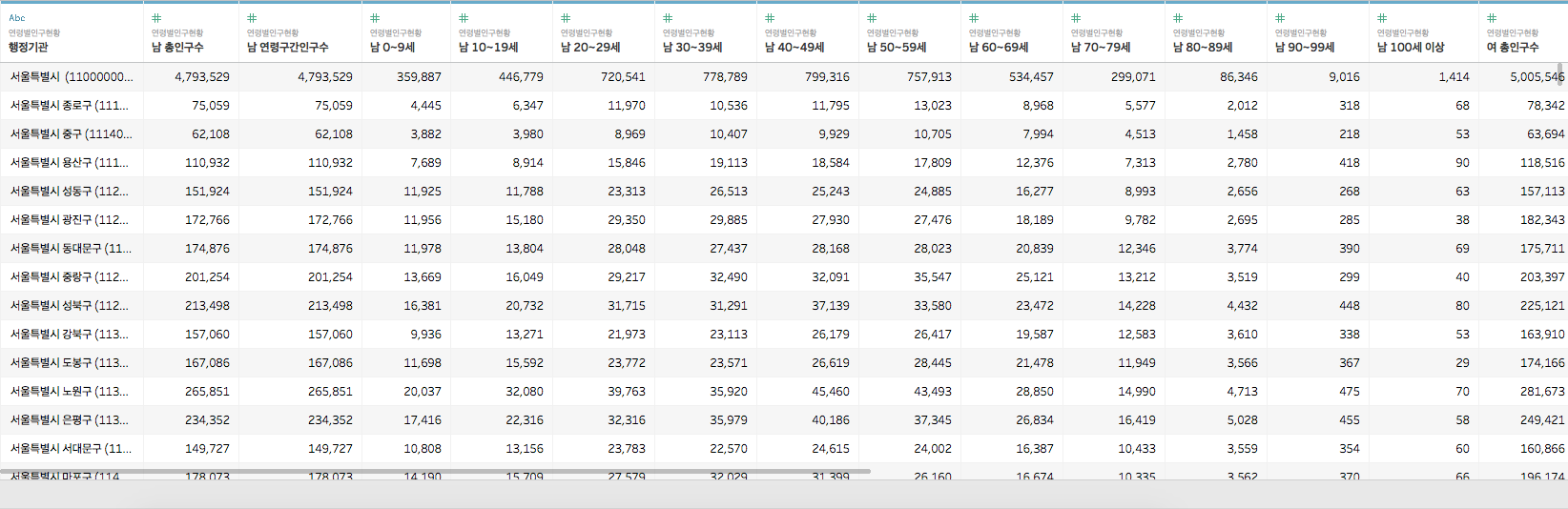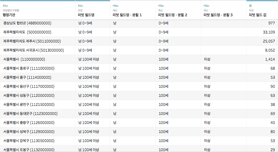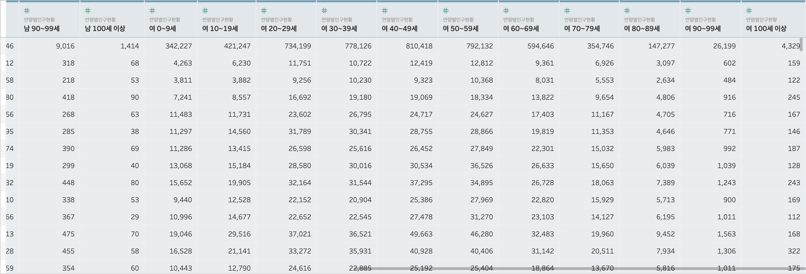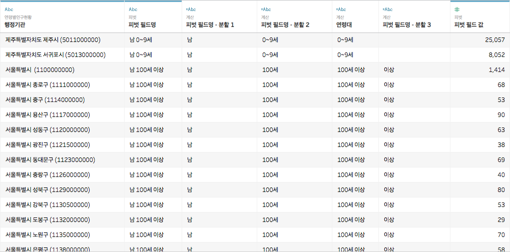 제일 왼쪽 행정기관, 남 총인구수부터 제일 오른쪽 여 100세 이상까지 나오고 있습니다