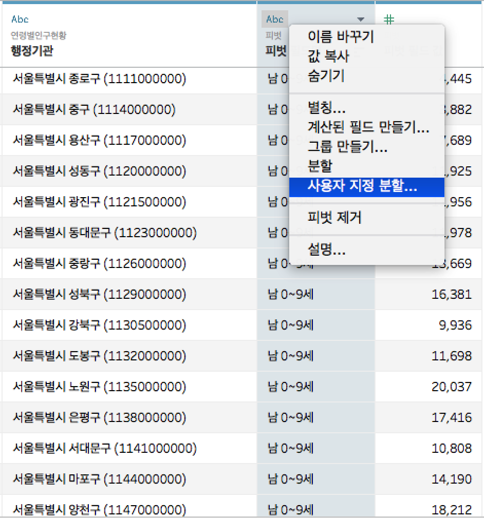 '행정기관 - 분할 1'의 헤더 부분을 우클릭한 후 사용자 지정 분할을 눌러주면 되겠지요?