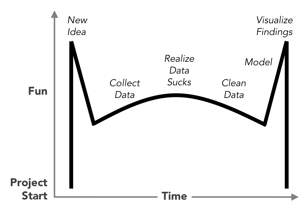 데이터가 쓰레기 같다는 것을 인식한 후 클린징하는 작업에서 계속 재미가 떨어지는 곡선이 보이죠