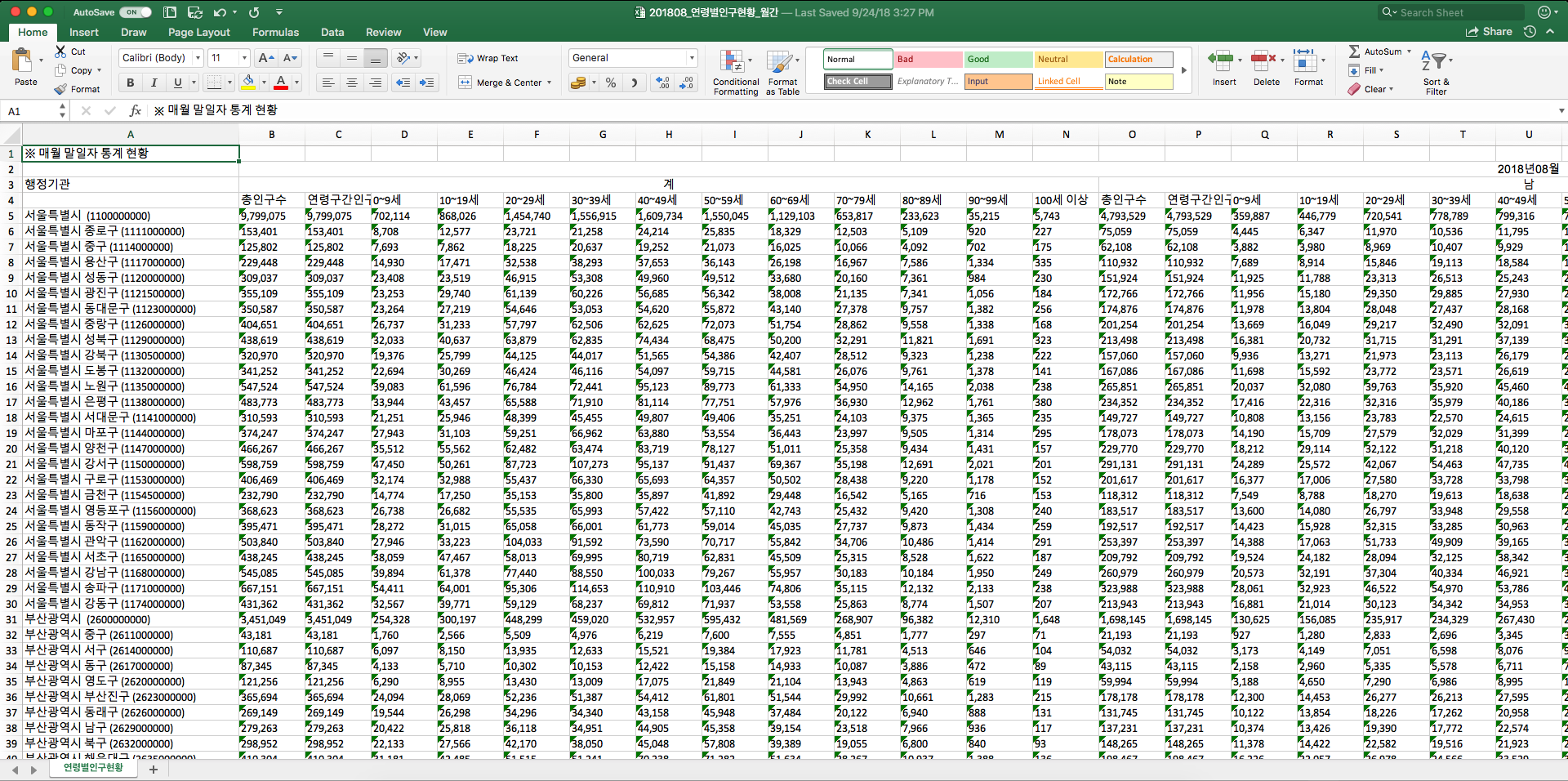 오늘 실습에 활용할 데이터는 2018년 8월 기준 주민등록 인구 데이터입니다