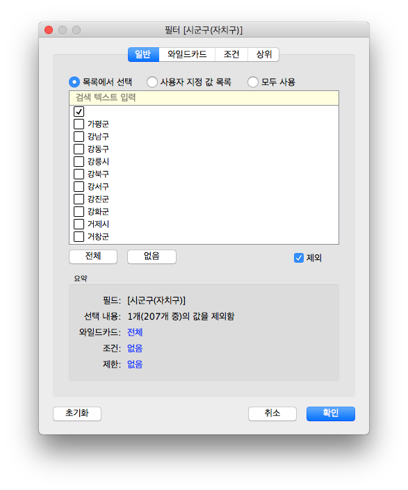 시군구(일반구)까지 드릴 다운되어있는 행을 필터링할 수도 있습니다