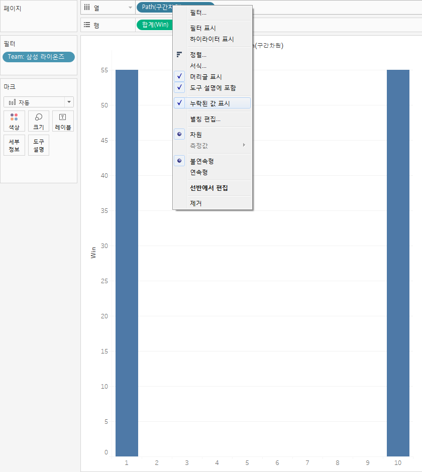 혹시 오른쪽 그림처럼 1, 2, 3, ..., 10까지 보이지 않는다면, 구간차원의 누락된 값 표시가 체크되어 있는지 확인해보면 됩니다