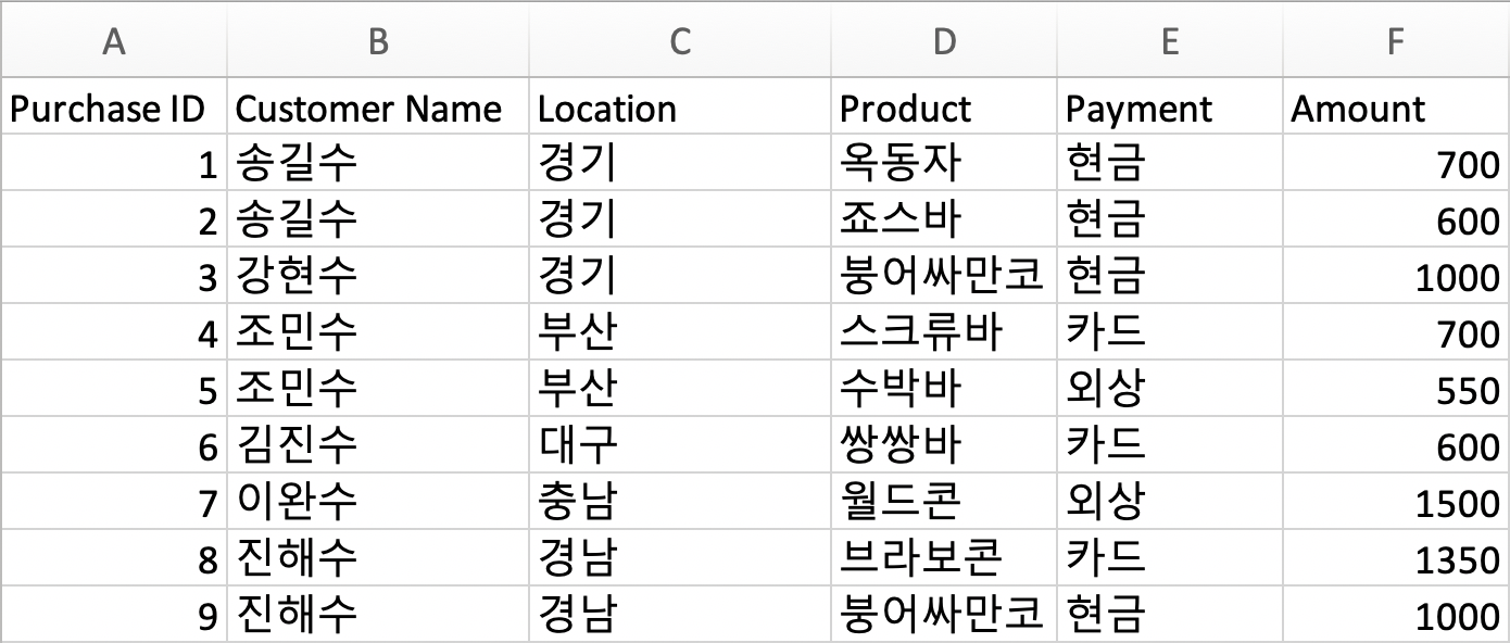다음의 샘플 데이터를 통해서 연습해봅시다
