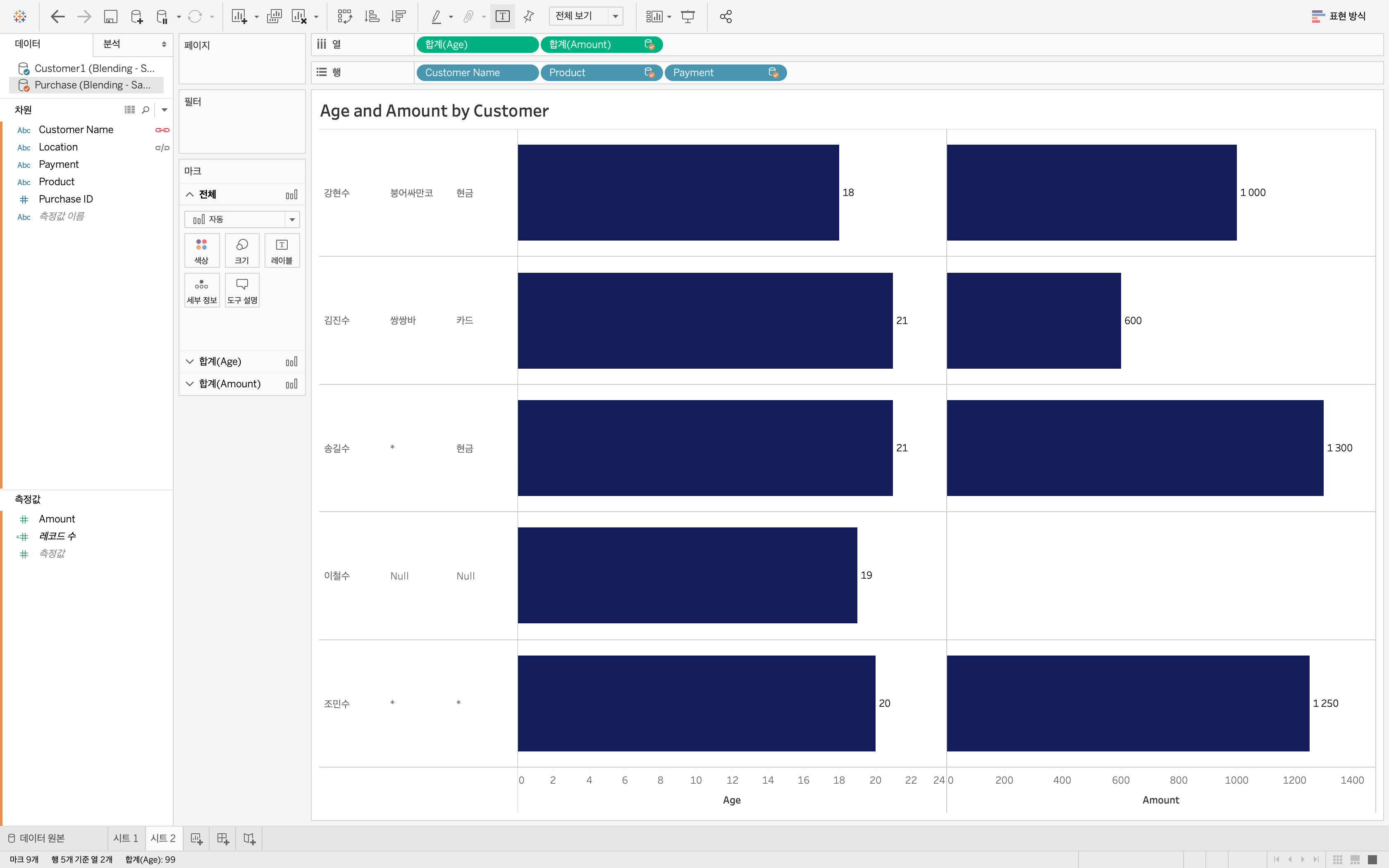 데이터 준비창에서 위와 같은 조인 작업을 마무리한 후 데이터 작업창(시트)으로 넘어가면 목표한 화면을 쉽게 만들 수 있지요