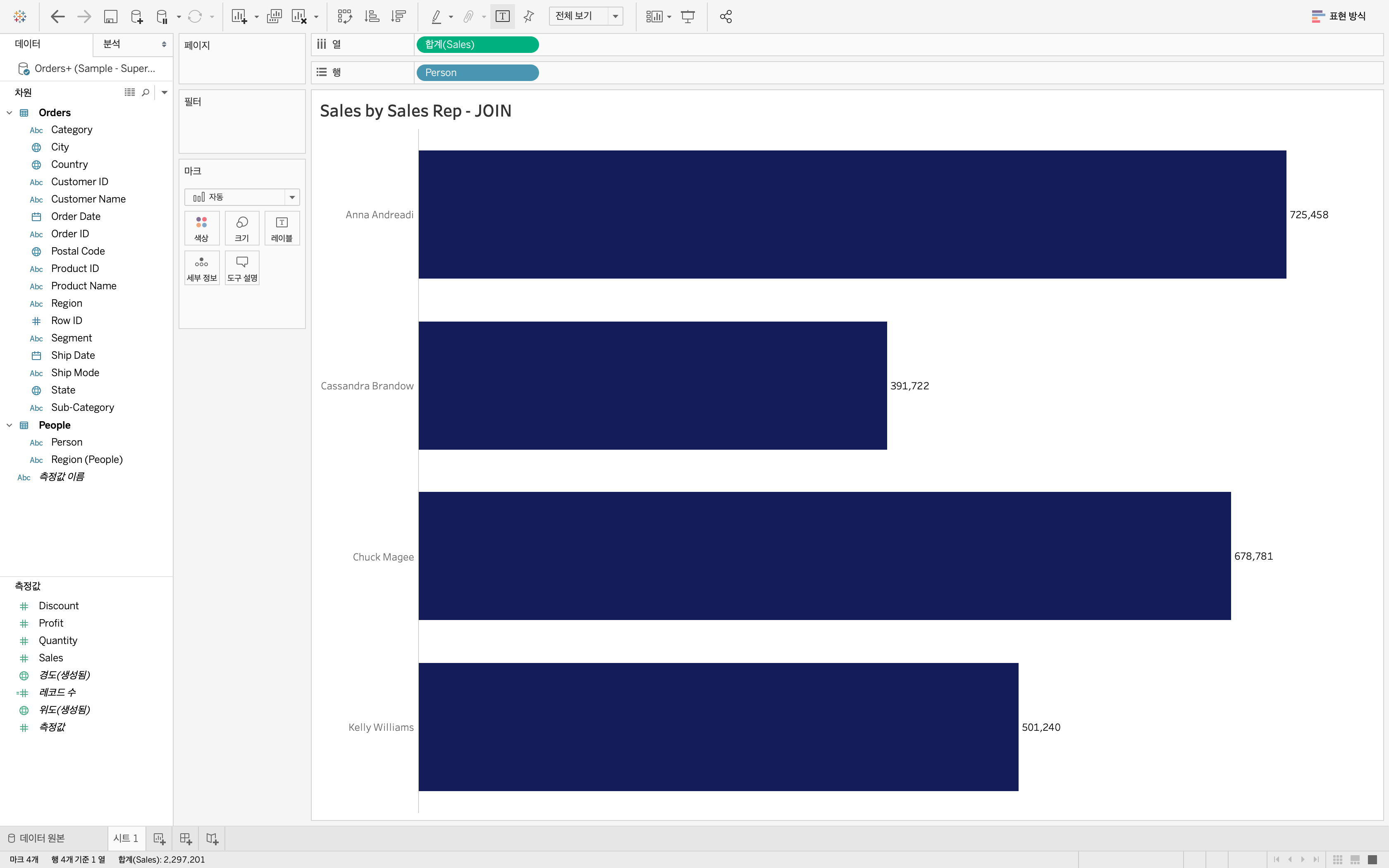 그런 후에 데이터 작업창으로 넘어와 Sales 필드가 Person 레벨에서 집계되고 있습니다